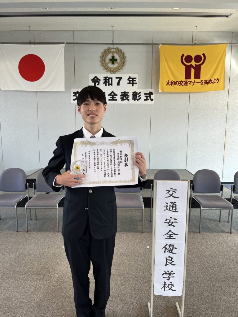 令和7年度奈良県交通安全表彰式にて、本校が「交通安全優良学校(奈良県交通安全協会会長表彰)」として表彰されました。西大和学園は全ての生徒の尊い命を守り、安全な登下校を実現する責務として、今後も交通安全啓発活動に尽力してまいります。