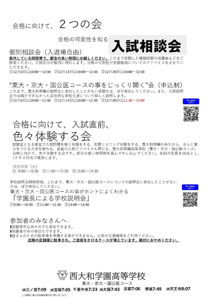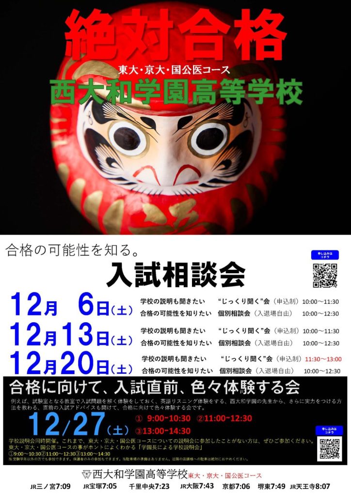 『西大和学園高等学校(東大・京大・国公医コース)入試相談会&色々体験する会』の申込が始まりました。
